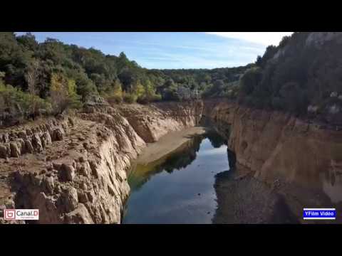 Ferme Pdagogique Hrault }}- Une ferme aux pigeonniers donnant l'air d'un château médiéval, et survol du lac d'Artignosc vidangé, avec l'ancien pont St Laurent sur le Verdon.